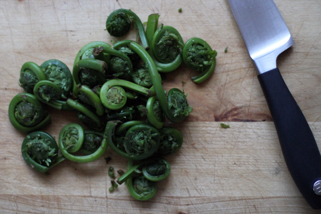 Fiddleheads! Hooray! Not only are they fleeting and extremely local, but they are one of the very first fresh vegetables that becomes available in the spring. They are the harbinger of more great seasonal dishes to come, and I love them both for their delicious fresh flavor and for the happy tidings they bring.